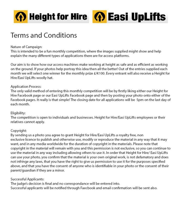 We are now running a new Photo of the Month competition! To enter all you have to do is like either our Height for Hire Facebook page or Easi UpLifts Facebook page and then post your photo of our machine working onto either of the Facebook pages. It couldn't be easier!