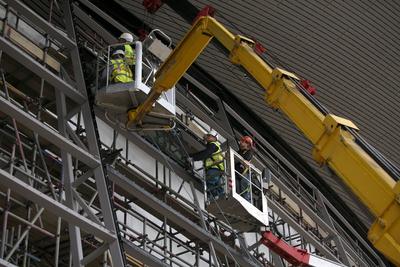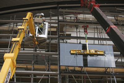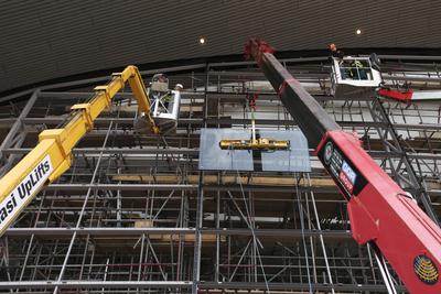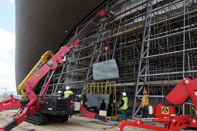 Some Facts: There are 628 panes of glass in total – 314 panes each side. The panes of glass are 1500mm x 3000mm with a few larger / smaller. In total, the glass covers 2,800m². The standard weight is 250kg. The heaviest piece is 377kg. The total weight of the glass is 148,470kg or 74.235kg each side. It will take 70 days to put the glass in – 35 days per side. It takes a team of six to install each pane 10 panes of glass will be installed each working day