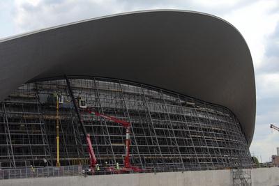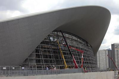 The Aquatics Centre’s permanent shape can be clearly seen as the first panes of glass were installed today. The temporary seating stands, which held 15,000 seats for Games-time, have been removed revealing the incredible Zaha Hadid design.Now the first of 628 panes of glass have been installed and the Centre – which will open to the public from spring 2014 – is beginning to take shape.