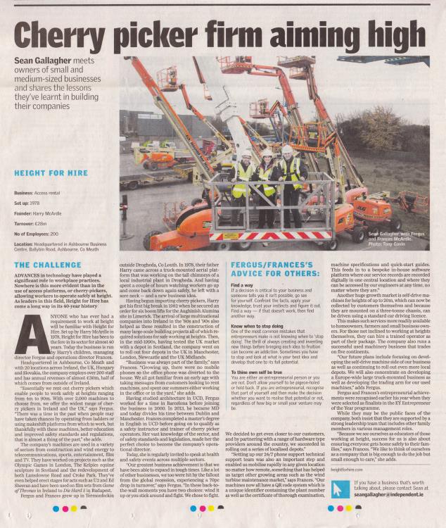 Height for Hire were delighted to find themselves in print this week in the Sunday Independent.