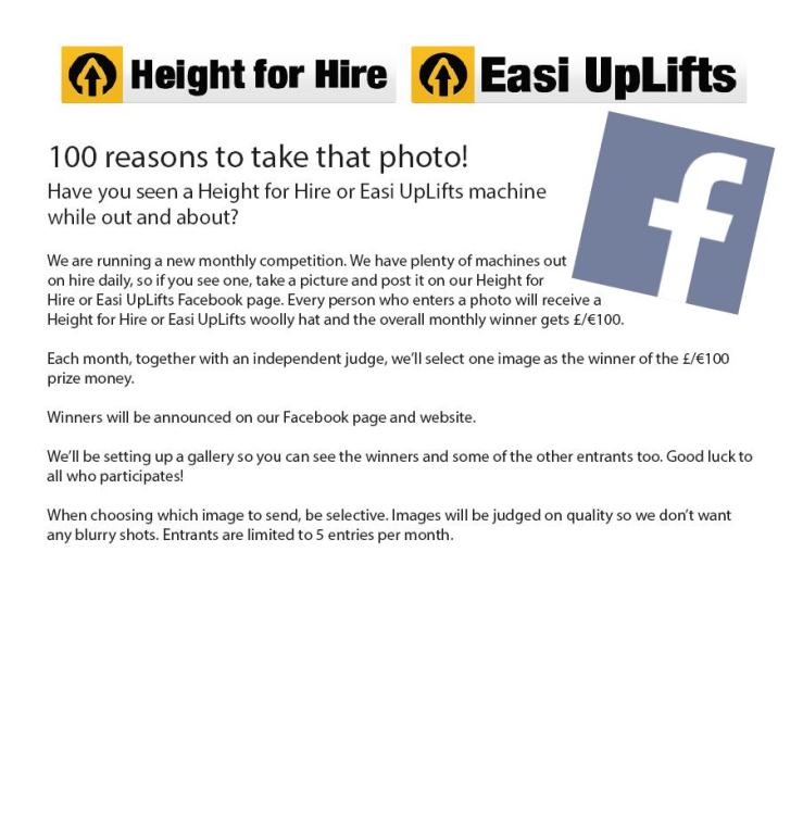We are now running a new Photo of the Month competition! To enter all you have to do is like either our Height for Hire Facebook page or Easi UpLifts Facebook page and then post your photo of our machine working onto either of the Facebook pages. It couldn't be easier!