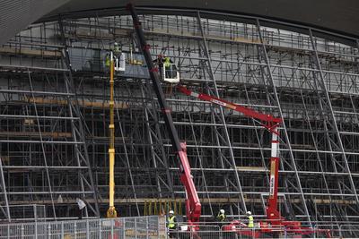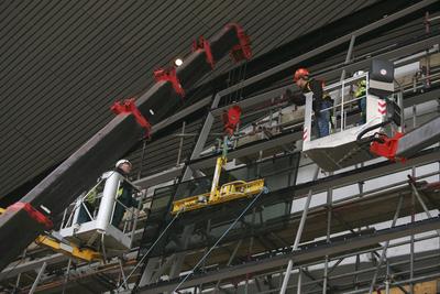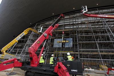 Some Facts: There are 628 panes of glass in total – 314 panes each side. The panes of glass are 1500mm x 3000mm with a few larger / smaller. In total, the glass covers 2,800m². The standard weight is 250kg. The heaviest piece is 377kg. The total weight of the glass is 148,470kg or 74.235kg each side. It will take 70 days to put the glass in – 35 days per side. It takes a team of six to install each pane 10 panes of glass will be installed each working day