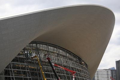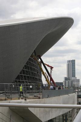 The Aquatics Centre’s permanent shape can be clearly seen as the first panes of glass were installed today. The temporary seating stands, which held 15,000 seats for Games-time, have been removed revealing the incredible Zaha Hadid design.Now the first of 628 panes of glass have been installed and the Centre – which will open to the public from spring 2014 – is beginning to take shape.