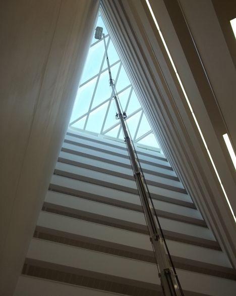 The building houses a 46 metre high internal atrium, which needed cleaning along with slight repairs to the roofing systems. However the only access to the site was through a 1.4 wide doorway, making it impossible for larger powered access equipment to enter the building. Once inside, the floor space was also at a premium, leaving just enough room for the machine to be set up and operated.